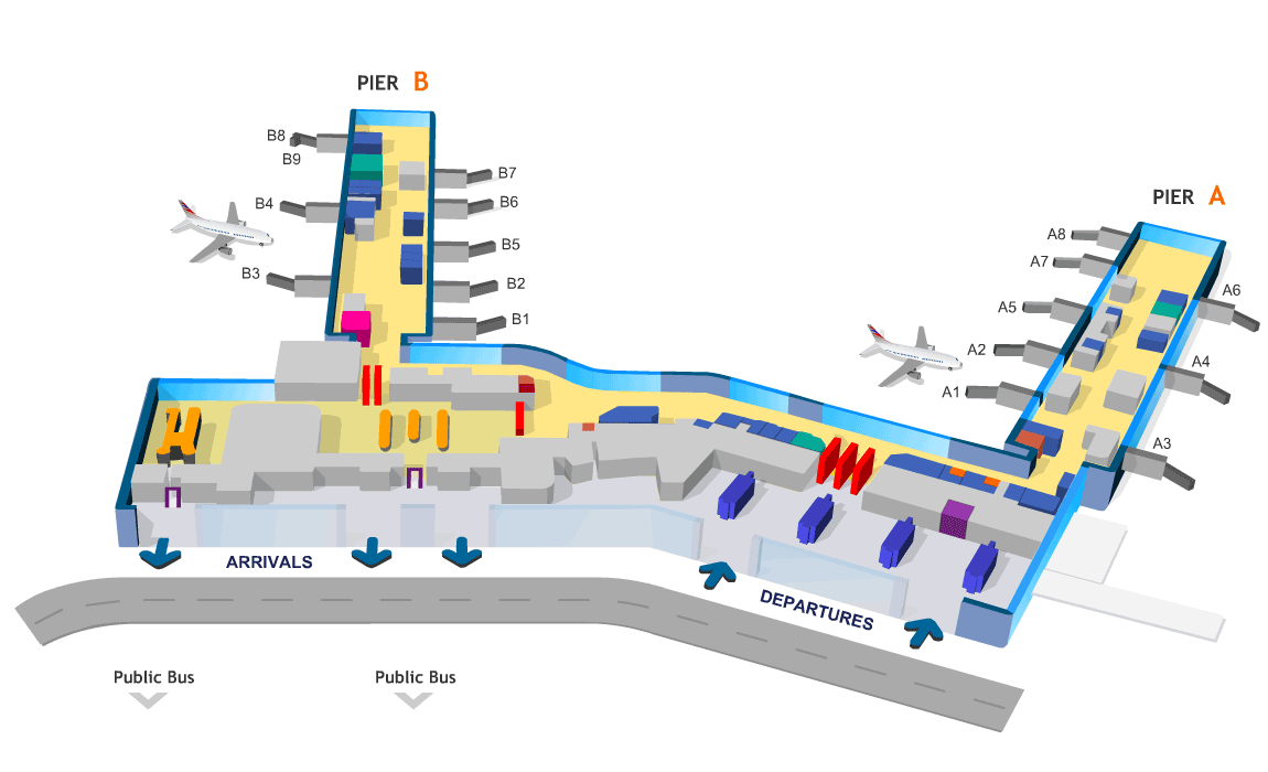 Схема аэропорта Прага и карта его терминалов укажут правильный маршрут от входа до посадки на рейс. Просмотр схемы терминала