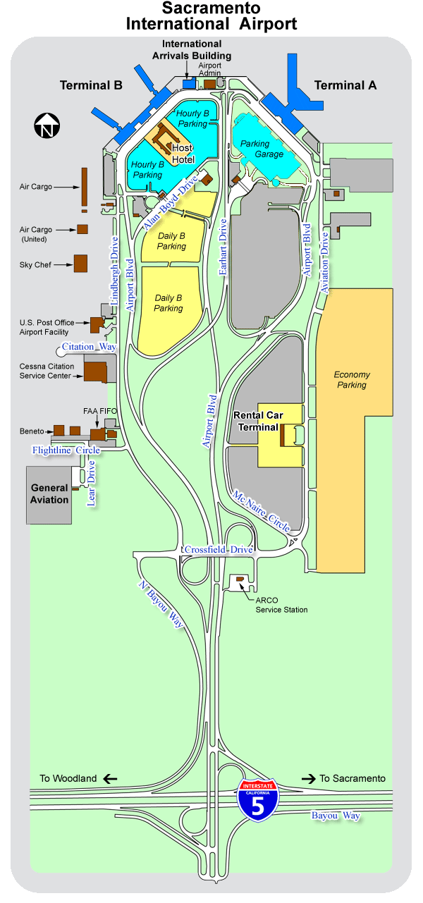 Схема аэропорта Сакраменто и карта его терминалов укажут правильный маршрут от входа до посадки на рейс. Просмотр схемы терминала